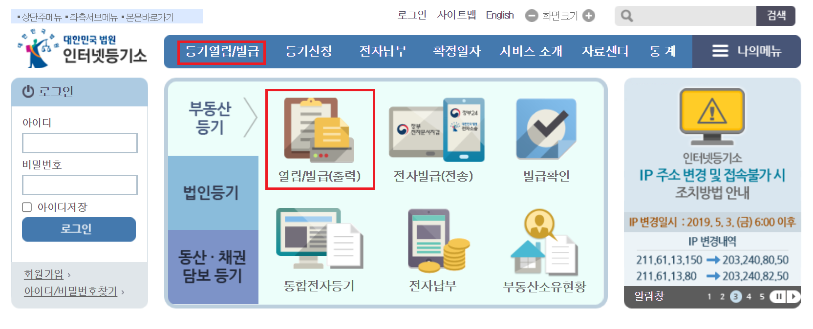 접속하면 메뉴 중 바로 보이는 '부동산등기>열람/발급(출력)'을 클릭합니다.