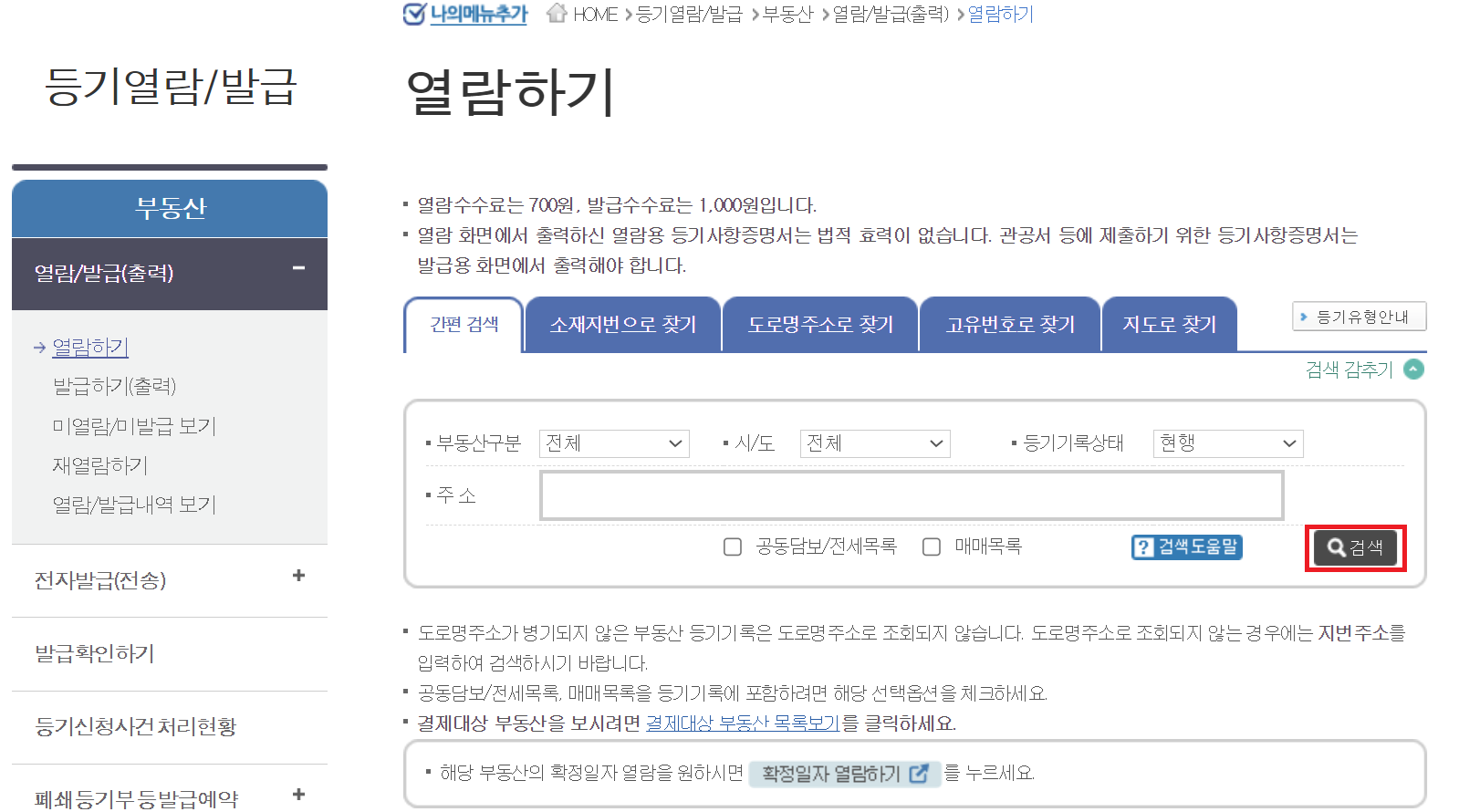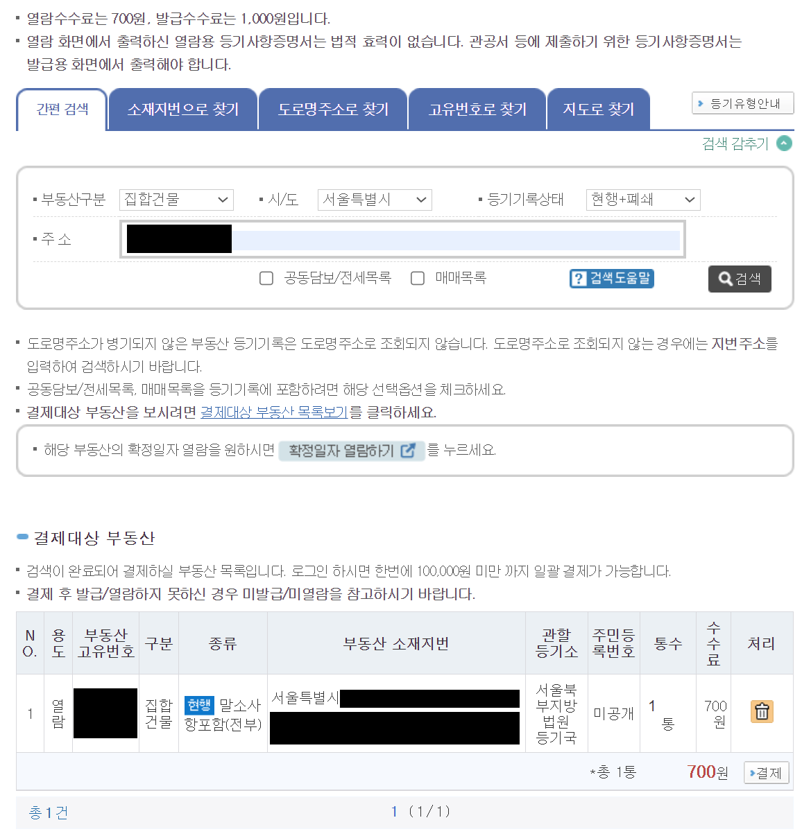 부동산구분을 집합건물(아파트)를 선택, 서울시, 현행+폐쇄를 클릭하여 주소를 기입하여 검색합니다. 열람수수료는 700원 발생이되고 발급수수료는 1,000원 발생됩니다.
