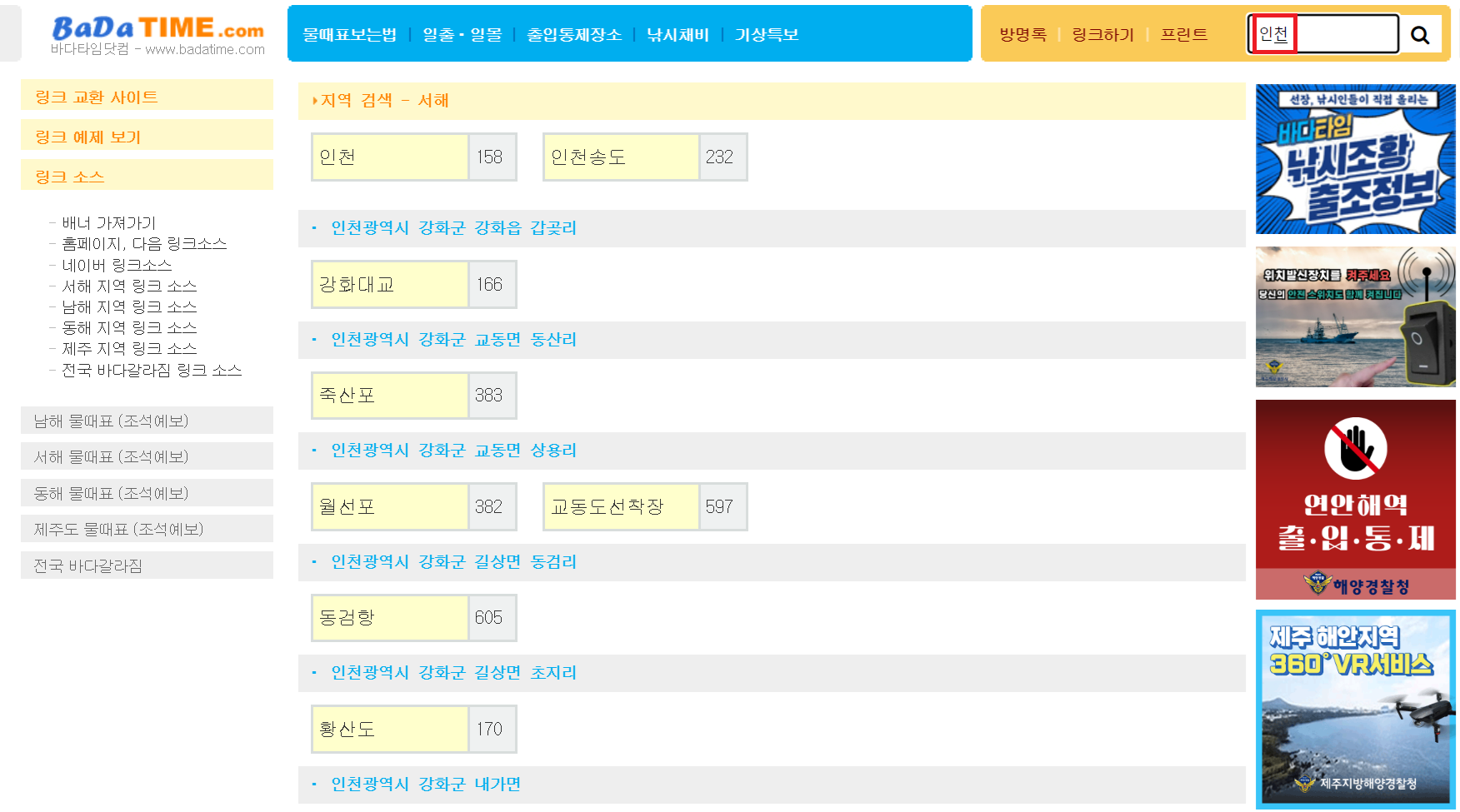 지역을 선택했다면 이후에 만조시간과 간조시간을 확인합니다. 해루질을 하거나 낚시할 시간을 결정하기 때문에 중요합니다.