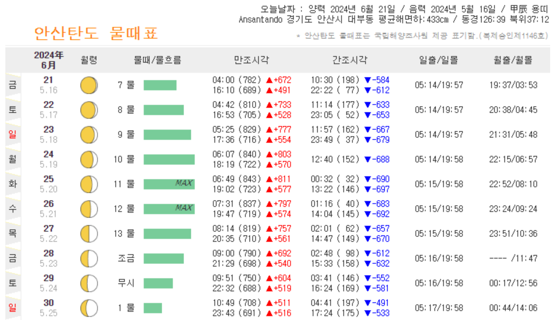 - 조석 : 바다의 물이 들어오고 나가는 시작점의 (만조, 간조) 일별 시간표시