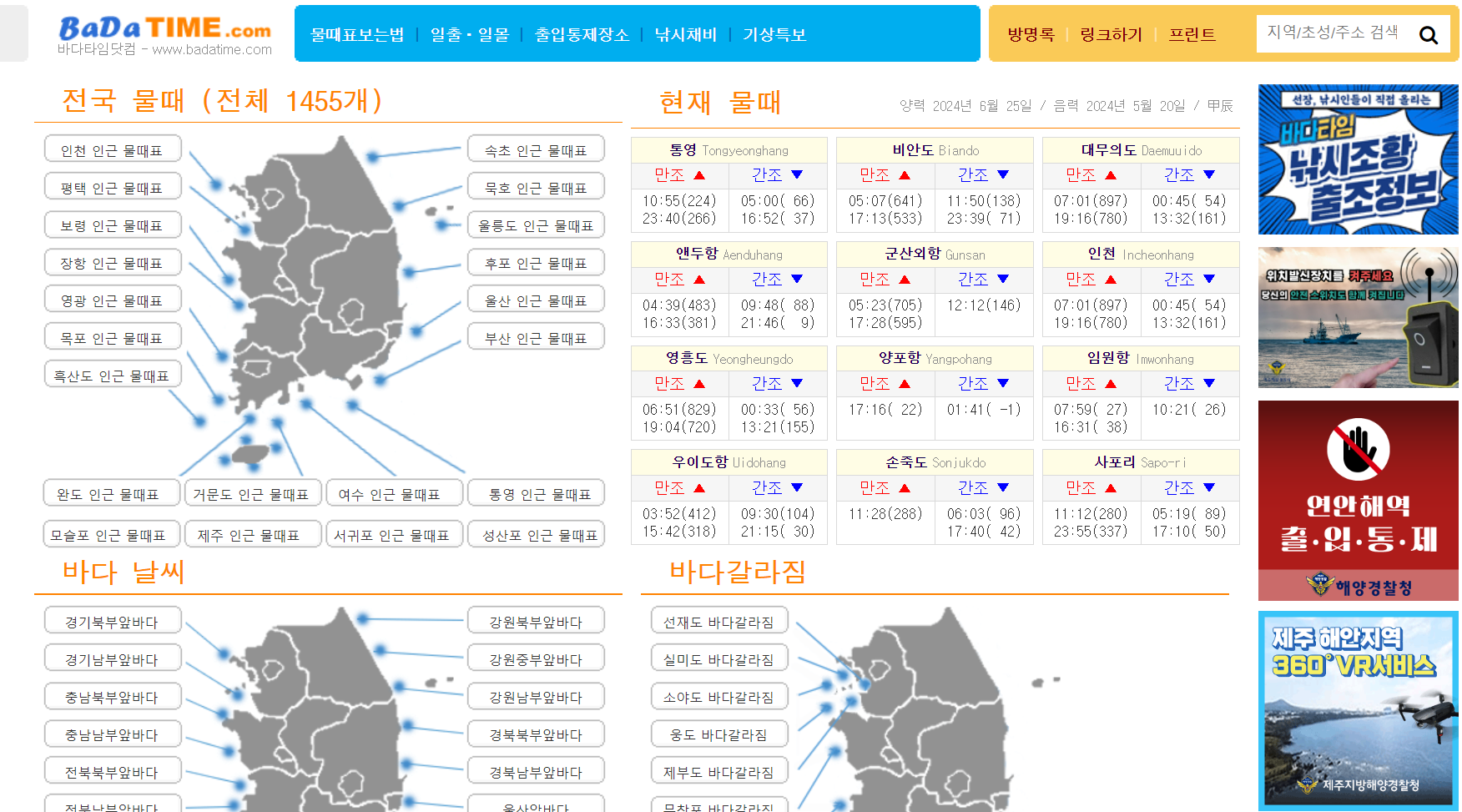 전국 물때표를 볼 때는 바다타임이라는 사이트를 이용합니다. 전국 물때표와 현재물때, 바다날씨, 바다갈라짐, 수온, 낚시포인트까지 안내해줍니다.